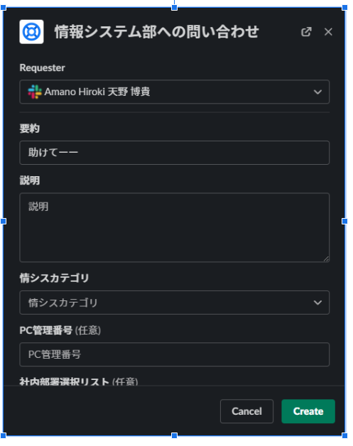 絵文字を入力したタイミングでJSM側のどのリクエストに紐づけするのか選択します。
