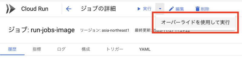 3.で作成したジョブを選択し、「オーバーライドを使用して実行」を押下します。