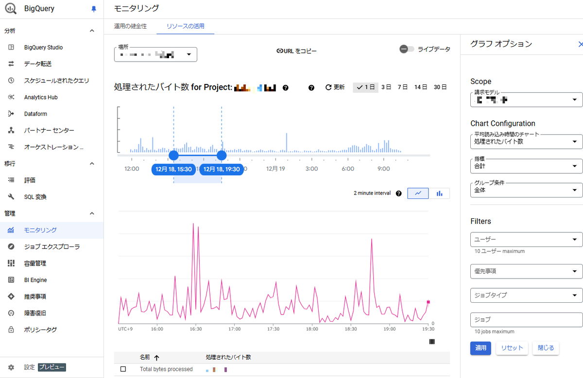 | 各リソース使用状況の時系列サマリ | BigQuery > モニタリング(BigQuery Monitoring) | 「リソース活用(Resource utilization)」タブを選択すると表れるダッシュボード内の「グラフオプション」でリソース項目などを選択する | リソースの使用状況を表示する | 図2 |