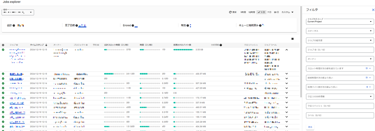 BigQueryのナビゲーションパネルから「ジョブエクスプローラ」を選択すると、以下の画面が表示されます。