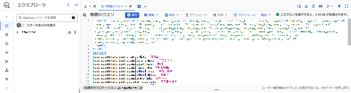 すると、ジョブエクスプローラからBigQuery Studioエクスプローラへ画面が遷移し、BigQuery Studioのクエリ作成ウィンドウの中に実際にクエリ実行したSQL文が表示されます(下図参照)。
