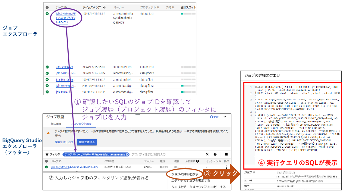 ジョブ詳細情報一覧を見ていると、それぞれのジョブでどのようなクエリが実行されたのか知りたい場合があります。 もちろん、ジョブエクスプローラから実際に実行されたクエリを確認することは、以下の手順で実質的に可能です。
