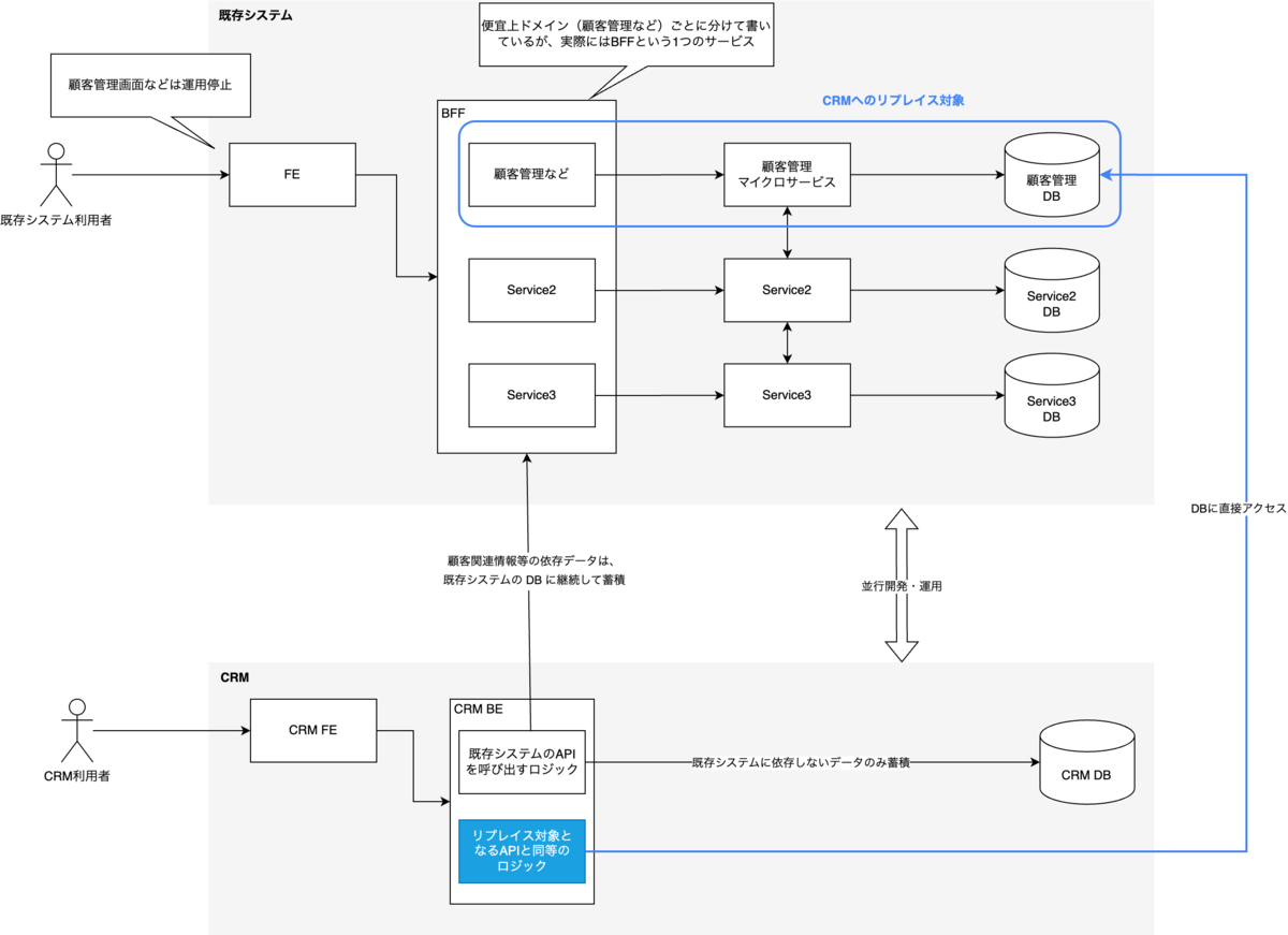 CRMのシステムリプレイスにおける計画としては、既存システムとCRMの両方を並行して開発・運用しながら、既存システムのAPIを徐々にCRMへ移行し、既存システムの顧客管理ドメインにあたるサービスを停止させるものです。