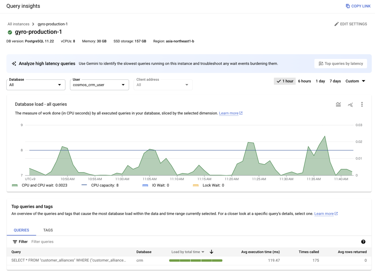 既存システムのDBではCloud SQLを採用しているため、Query Insightsを有効にすることで、ログからDBユーザーとSQLクエリの実行内容を把握することが可能です。